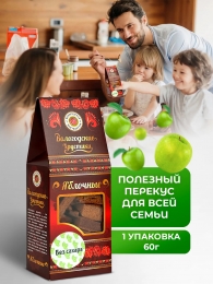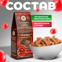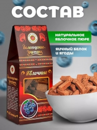 Вологодские яблочные хрустики без сахара с черникой это незабываемое лакомство, от которого сложно оторваться Хрустики похожи по внешнему виду на обычные хлебные сухарики, но делаются они не из муки, а из яблочного пюре с добавлением яичного белка. Пюре с белком взбивают, высушивают массу в русских печах, затем пласты нарезают на маленькие брусочки и еще подсушивают до такого состояния, чтобы они хрустели. Это лакомство можно употреблять как с чаем или кофе, так и самостоятельный перекус. Хрустики без сахара очень любят те, кто следит за своей фигурой, от них невозможно поправиться! Хрустки упаковывают в нарядные картонные домики, что делает их более презентабельными. В составе хрустиков содержится натуральный пектин, поэтому десерт помогает улучшить обмен веществ и нормализовать содержание холестерина в крови. Без сахара! Без ГМО! Без красителей! Без ароматизаторов! Попробуйте Хрустики без сахара и убедитесь, что это любовь с первого хрума!