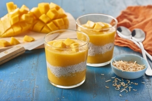 Раскладываем пудинг по стаканам, сверху добавляем манговое пюре.