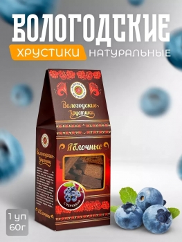 Вологодские яблочные хрустики без сахара с черникой это незабываемое лакомство, от которого сложно оторваться Хрустики похожи по внешнему виду на обычные хлебные сухарики, но делаются они не из муки, а из яблочного пюре с добавлением яичного белка. Пюре с белком взбивают, высушивают массу в русских печах, затем пласты нарезают на маленькие брусочки и еще подсушивают до такого состояния, чтобы они хрустели. Это лакомство можно употреблять как с чаем или кофе, так и самостоятельный перекус. Хрустики без сахара очень любят те, кто следит за своей фигурой, от них невозможно поправиться! Хрустки упаковывают в нарядные картонные домики, что делает их более презентабельными. В составе хрустиков содержится натуральный пектин, поэтому десерт помогает улучшить обмен веществ и нормализовать содержание холестерина в крови. Без сахара! Без ГМО! Без красителей! Без ароматизаторов! Попробуйте Хрустики без сахара и убедитесь, что это любовь с первого хрума!