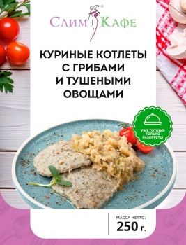 Куриная котлета с грибами и тушеными овощами - классическое блюдо, а приготовленное в СлимКафе - оно еще является и диетическим. Нежные, очень вкусные котлеты из филе куриной грудки с шампиньонами и тушеными овощами. Куриная котлета с шампиньонами - низкокалорийное, содержащее много полезных для организма веществ, пользуются популярностью у тех, кто следит за фигурой, занимается спортом, ведь в курином филе много белка и мало калорий. Прекрасный вариант для будничной семейной трапезы. Вкус детства, исполненный в легком диетическом варианте с овощным гарниром.