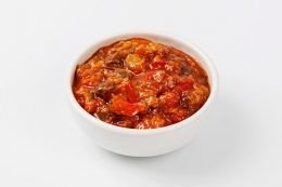 Ароматная закуска из баклажанов со сладким перцем и лучком, приправленных густым томатным соусом. Благородный вкус обжаренных овощей оттеняют чеснок и петрушка, придавая ему выразительные пряно-пикантные нотки.