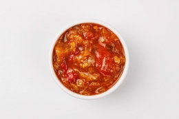 Сочное рагу из баклажанов, томатов и сладких перцев, приготовленное по диетическому рецепту: без сахара и масла. Во вкусе блюда преобладает звучание спелых овощей, оттенённое пряными нотами свежей петрушки. Закуску можно подать в роли салата, вместе с основным блюдом или просто с хлебцами. Благодаря низкой калорийности — меньше 110 ккал на целую банку — аджапсандал впишется даже в строгий рацион.