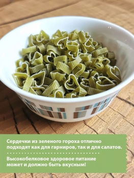 Макароны детские без глютена Сердечки уникальны сочетанием полезных свойств, приятным вкусом с легкими нотами гороха и привлекательной для любых кулинарных изысков формой изделий.