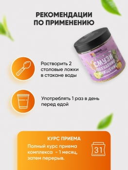 Способ применения: для непосредственного употребления в пищу предварительно растворив 2 столовые ложки смеси в стакане воды 200-250 мл перед едой. Дать настояться напитку, затем перемешать ложкой